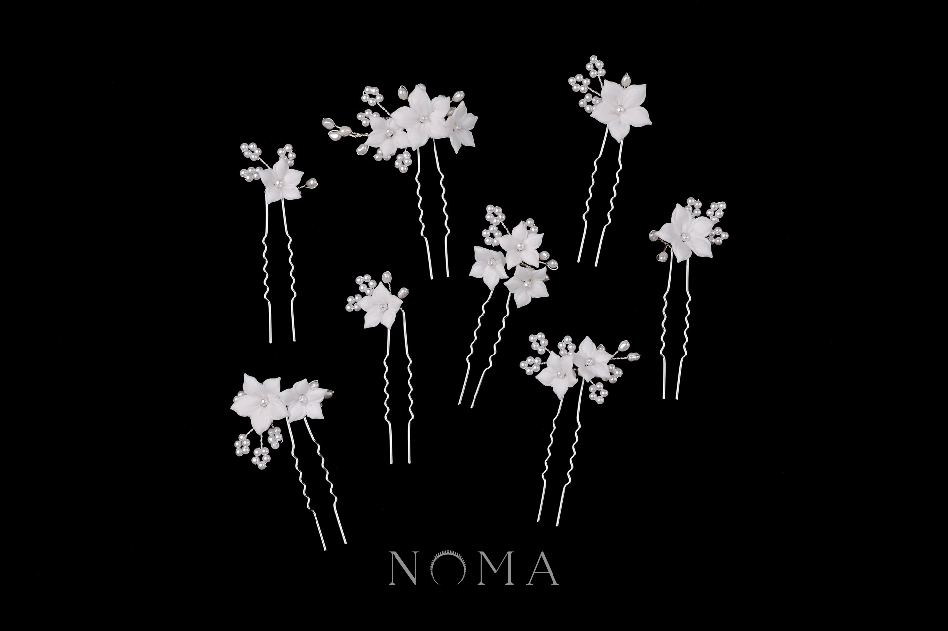 Clay Flower Jasmine Pearly Hairpin Set – White Silver (8 pcs)