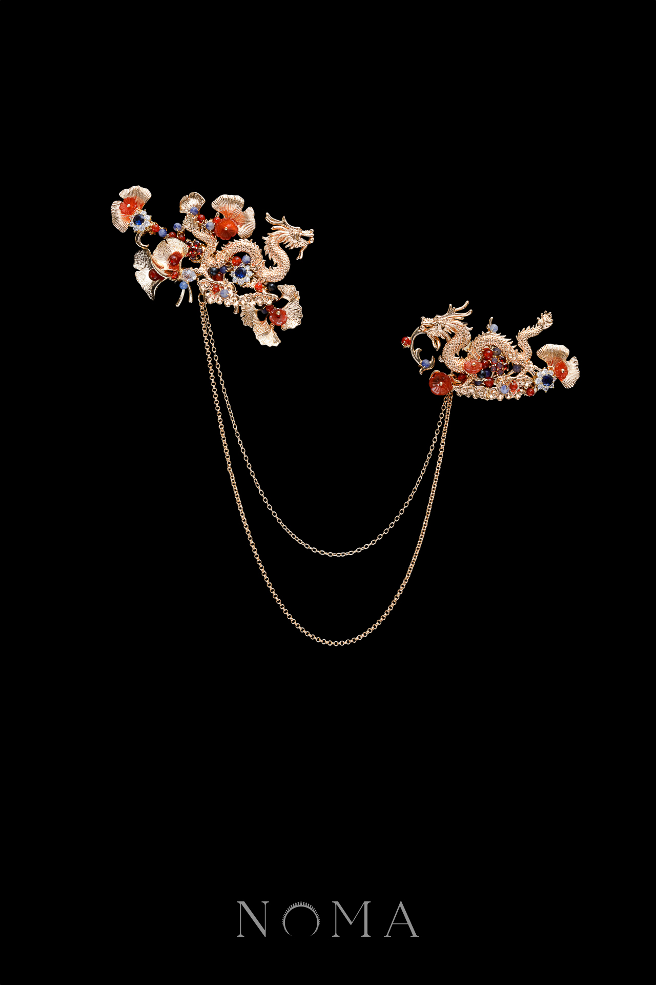 Chained Dragon Ginkgo Brooch – Gold, Blue