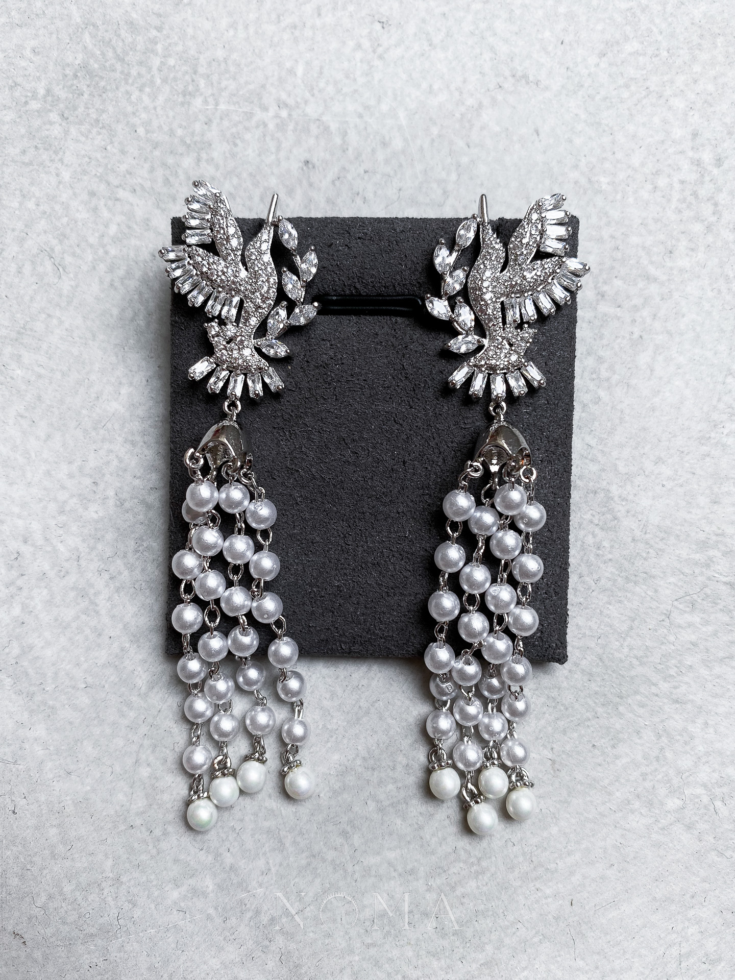 Pearl Chain Bird Earrings – Rhodium White Gold, White Diamond
